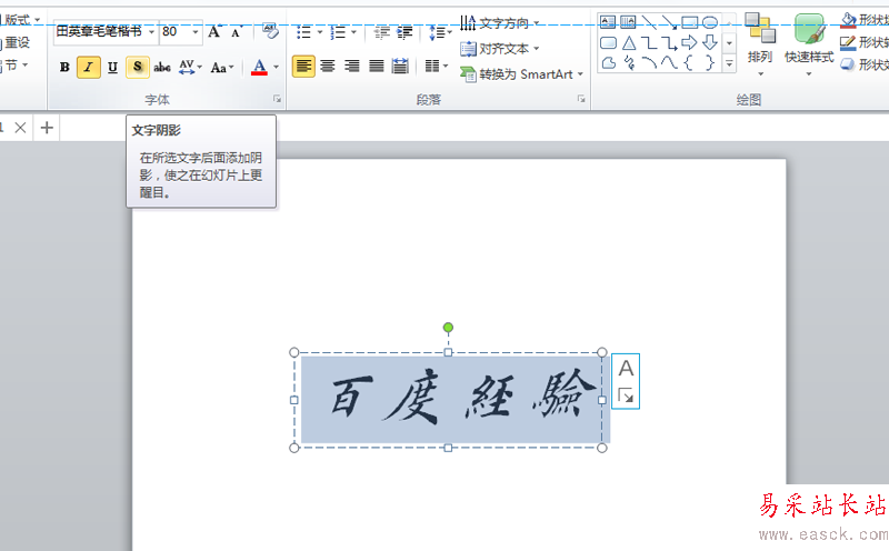1、首先啟動ppt2010,插入一個文本框,輸入文字內容,設置字體田英章毛筆楷書,字號80