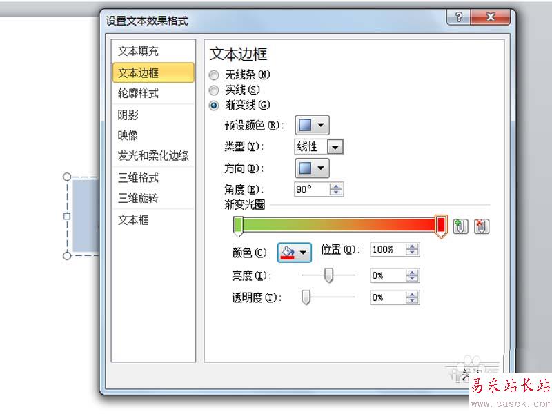 5、切換到文本邊框選項卡,勾選漸變線,設置漸變光圈為綠色到淺紅色。