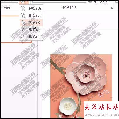 7、再點(diǎn)開(kāi)合并形狀的下拉按鈕。然后,我們選擇:拆分
