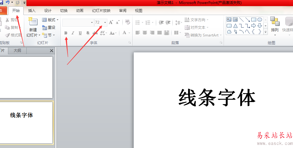 3、設置“線條字體”的大小和粗細。這里選用字號72號,宋體字,加粗。