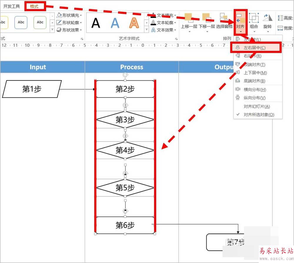 在對齊、調整間距后,我們還要將這些對象批量移動到表格的中間位置(Process下方)。