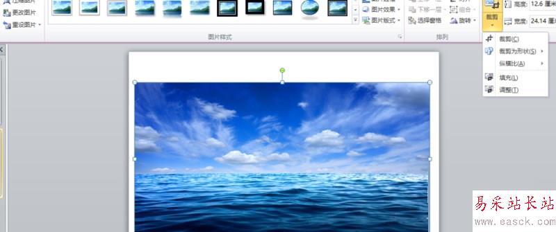 4、現在那我們以這張圖片作為背景。我們在插入一張剪切型的圖片。先進行新建一個空白版式的頁面。在空白的頁面里面插入同一張圖片。然后點擊圖片,再繪圖工具里面找到一個剪切。把這張圖片剪切只留下海水。剪切完成以后我們再插入一個波浪形狀。這樣這張剪切畫就基本制作完成。