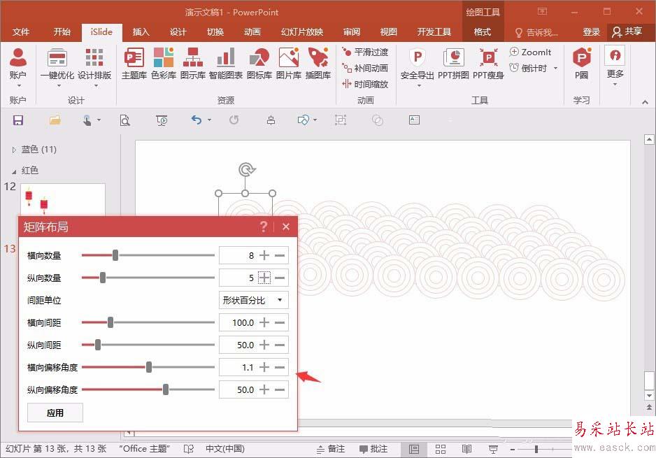 5、比如這里,參數(shù)設(shè)置為,橫向數(shù)量8,縱向5,橫向間距100,縱向50,橫向偏移角度1.1,縱向50(大小可以設(shè)置,隨意并沒有規(guī)定)。
