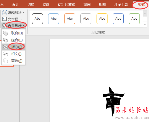 5、手指按住【shift】鍵,鼠標先點擊文字,再點擊繪制的曲線,選擇【格式】選項卡【合并形狀】中的【拆分】