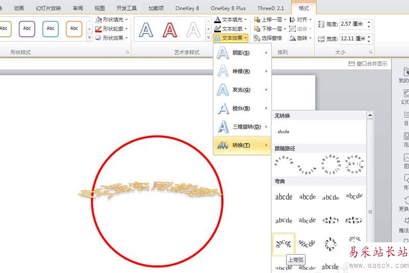 3、執行插入-藝術字,選擇一種樣式并輸入文字內容,設置文本效果為轉換里的上弧形,。