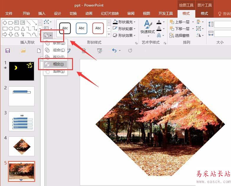 方法二:利用圖片與形狀進行組合,先插入形狀以及圖片——先選擇圖片,在選擇形狀(順序不能變)——格式,選擇相交,——完成效果。
