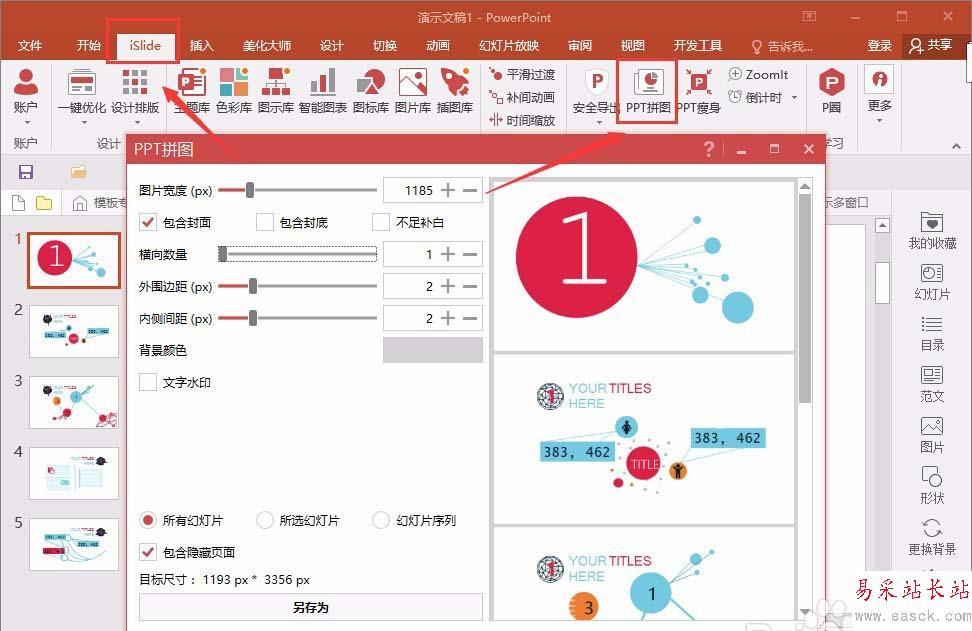 2、有了這個插件之后,選擇ppt拼圖,設置好相應的參數之后,選擇導出即可,比如這里,就設置為5張豎排成一隊列,其他的參數不設置。