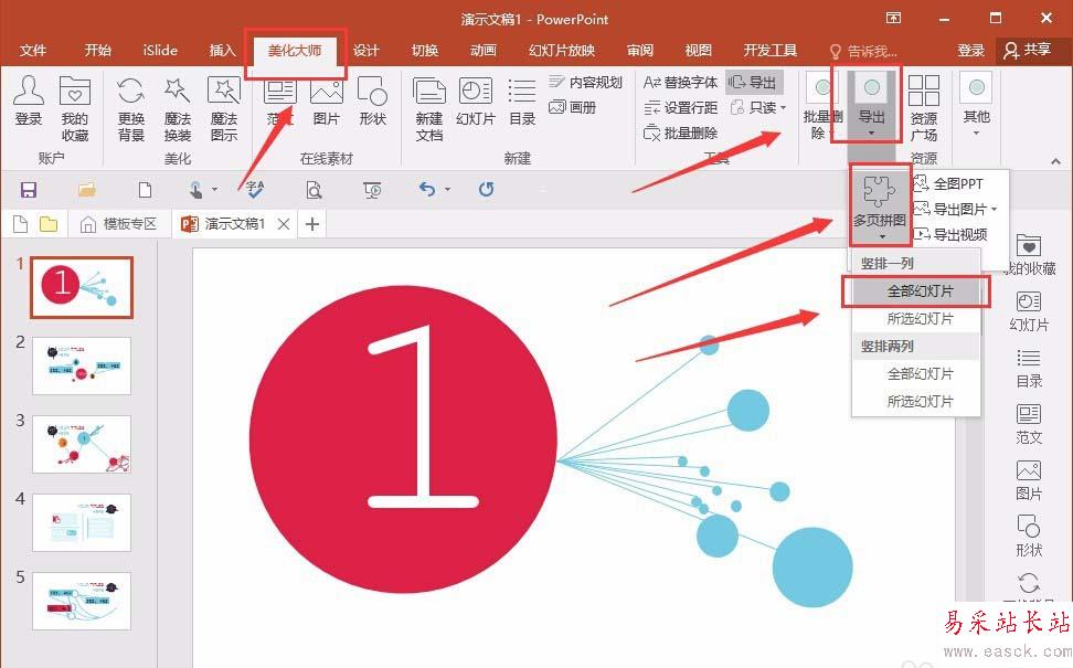 2、還是一樣下載安裝之后,選擇導出,多頁拼圖,可以選擇是豎排一列還是豎排兩列,并且可以選擇是全部幻燈片還是選擇的幻燈片,所以這個功能相對強大一些。