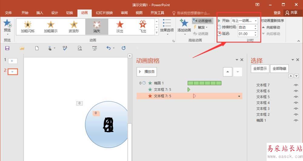 5、之后再對4-0這5個數字,以此插入動畫,都是選擇一樣“出現”與“消失”,不同的地方在于,“消失”動畫的設置,5延遲1秒,4延遲2秒,3延遲3秒,以此類推。