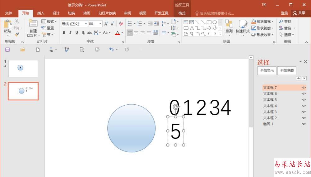 2、然后再輸入文本,選擇插入文本框,從0-5,分別輸入,然后再把文本拖到正圓中間,這里主要,要倒數,所以0在最底下,5在最上面。