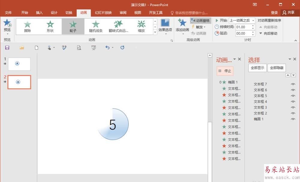 4、我們再對數字文本設置一下動畫,先從數字5開始,需要兩個動畫,第一個“出現”,開始為與上一個動畫同時;第二個“消失”開始為與上一個動畫同時和延遲1秒。