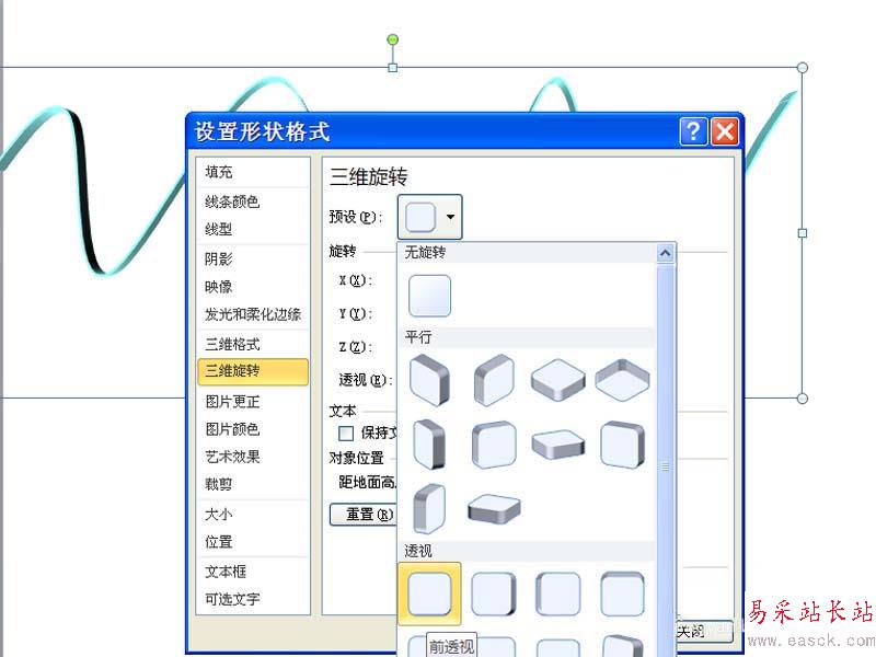 5、右鍵單擊選擇設(shè)置形狀格式選項,切換到三維格式選項卡,設(shè)置深度為30磅,切換到三維旋轉(zhuǎn),設(shè)置預(yù)設(shè)為前透視。