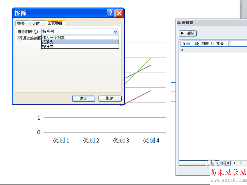 5、接著切換到圖表動(dòng)畫(huà)選項(xiàng)卡,組合圖表設(shè)置為按系列選項(xiàng),點(diǎn)擊確定按鈕。