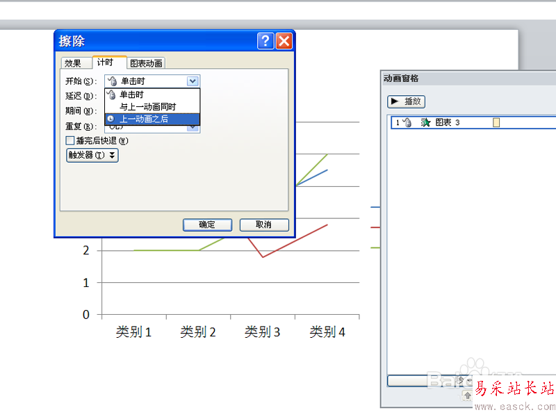 4、在彈出的擦除對(duì)話(huà)框中設(shè)置效果中方向?yàn)樽宰髠?cè),切換到計(jì)時(shí)選項(xiàng)卡,設(shè)置開(kāi)始為上一動(dòng)畫(huà)之后