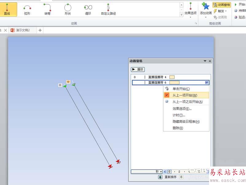 6、接下來調整路徑的方向和長度,選擇動畫窗格中的兩個動畫,設置為從上一項開始。