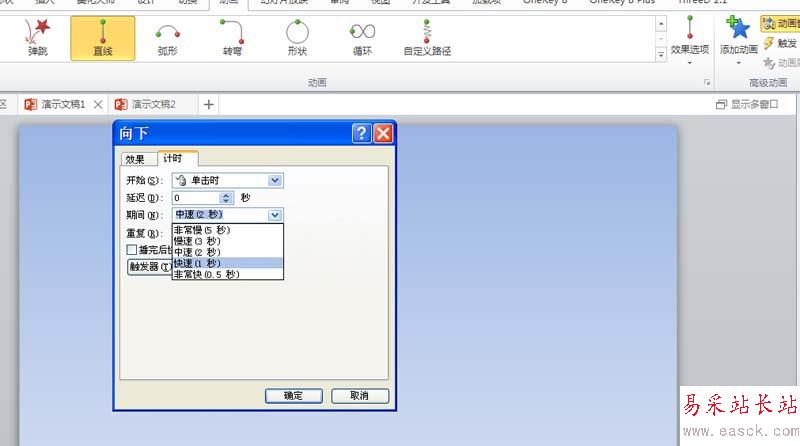 5、調出動畫窗格,調出計時對話框,設置期間為快速1秒,選擇第二條漸變線,執行同樣的步驟。