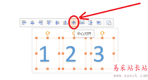 2、然后選中輸入的三個文本對像,選中后在上方出現的選項中選擇【中心對齊】。