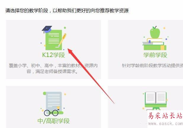 3、我現(xiàn)在選擇中小學(xué)學(xué)段,代號(hào)是K12,單擊相應(yīng)的圖標(biāo),進(jìn)入下一步。