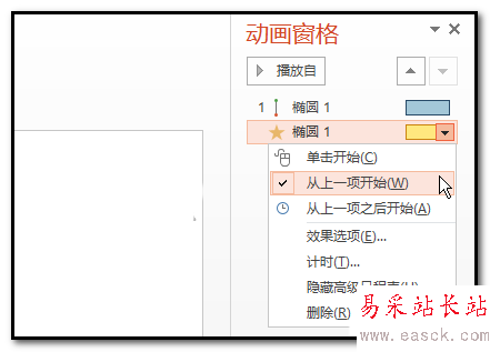 4、點擊陀螺旋的動畫右側的小三角,彈出面板中點:從上一項開始。設置了這個,才能使到動作路徑的直線動作與陀螺旋的動作一起進行。再雙擊陀螺旋動畫,彈出操作面板