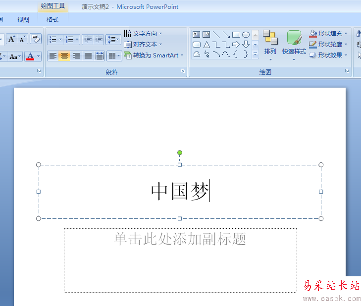 1、首先,我們打開演示文檔,在本框中輸入需要設置“一字雙色”的文字內容內容,如“中國夢”。
