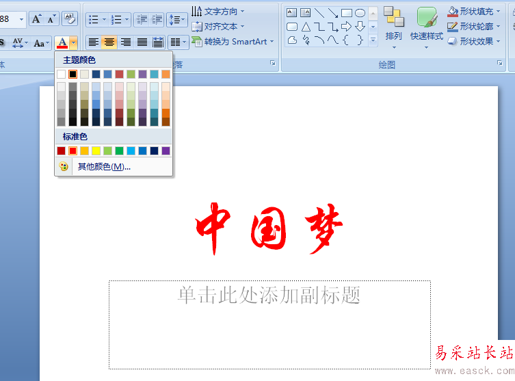 2、然后,把“中國夢”這三個字設置好第一種顏色,我們的第一顏色使用紅色,字體用行楷,如下圖: