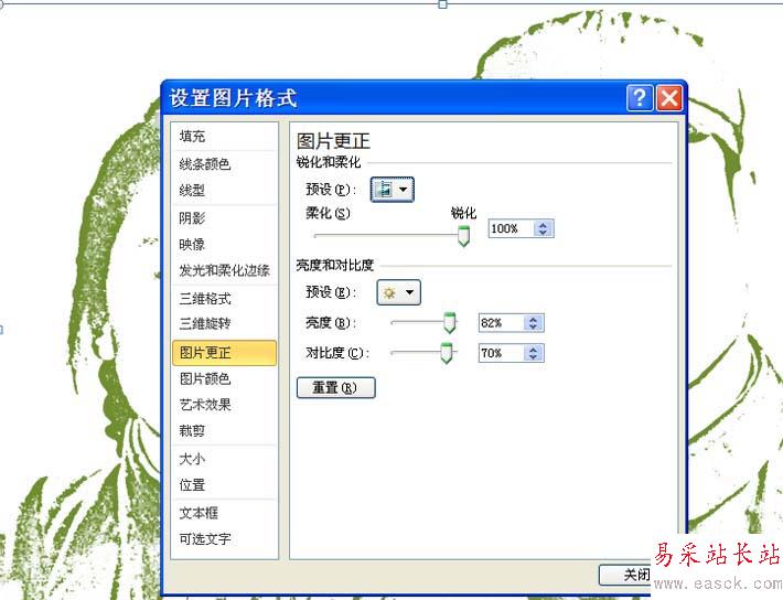 5、設置銳化為100%,亮度為82%,對比度為70%,點擊關閉按鈕。