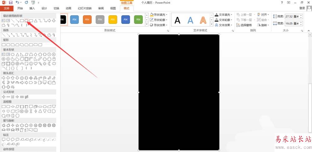 4、下面開始制圖,首先填一個背景,在插入——形狀中選擇矩形,填充為黑色。拉到頁面的大小即可。