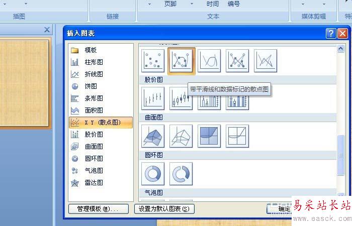 6、在【散點(diǎn)圖】中,可看到有不同風(fēng)格樣式的圖形,選擇一個(gè),數(shù)據(jù)用默認(rèn)的,可直接看到【餅圖】的圖表,如下圖所示。