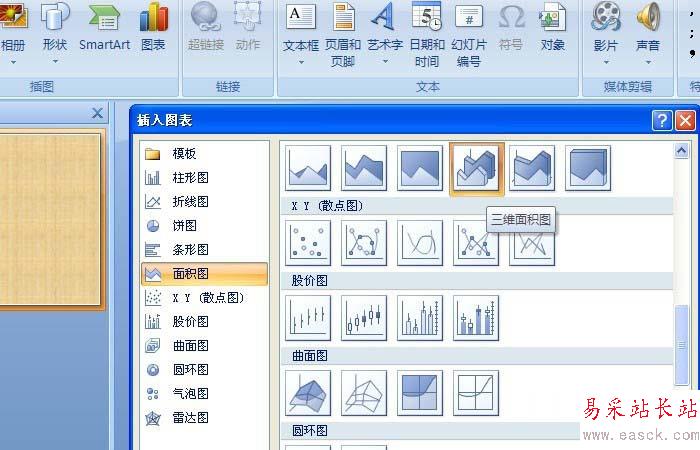 4、在【面積圖】中,可看到有不同風(fēng)格樣式的圖形,選擇一個(gè),數(shù)據(jù)用默認(rèn)的,可直接看到【面積圖】的圖表,如下圖所示。