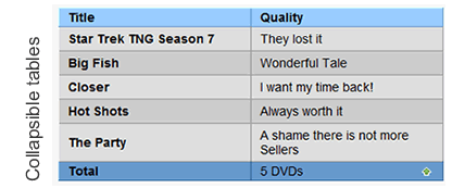利用dom 和css 建立的可折疊的表格效果。表格頁腳部分包含的箭頭有一個名為“footcollapse”的類,通過為之添加javascript 代碼可以讓表格展開或折疊。