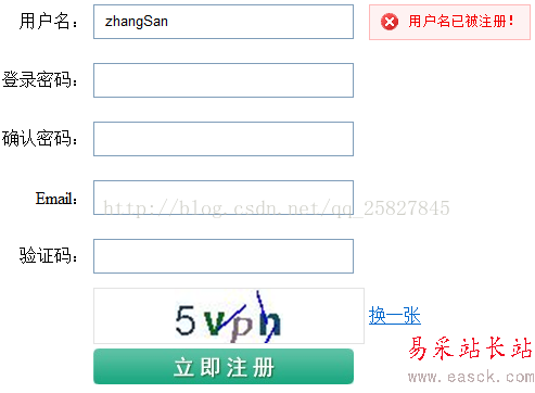整個過程中頁面沒有刷新,只是刷新頁面中的局部位置而已! 當請求發出后,瀏覽器還可以進行其他操作,無需等待服務器的響應!當輸入用戶名后,把光標移動到其他表單項上時,瀏覽器會使用AJAX技術向服務器發出請求,服務器會查詢名為zhangSan的用戶是否存在,最終服務器返回true表示名為zhangSan的用戶已經存在了,瀏覽器在得到結果后顯示“用戶名已被注冊!”。