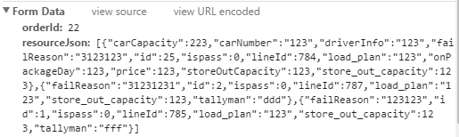 { "orderId": 22, "resourceJson": [ { "carCapacity": 223, "carNumber": "123", "driverInfo": "123", "failReason": "3123123", "id": 25, "ispass": 0, "lineId": 784, "load_plan": "123", "onPackageDay": 123, "price": 123, "storeOutCapacity": 123, "store_out_capacity": 123 }, { "failReason": "31231231", "id": 2, "ispass": 0, "lineId": 787, "load_plan": "123", "store_out_capacity": 123, "tallyman": "ddd" }, { "failReason": "123123", "id": 1, "ispass": 0, "lineId": 785, "load_plan": "123", "store_out_capacity": 123, "tallyman": "fff" } ]}