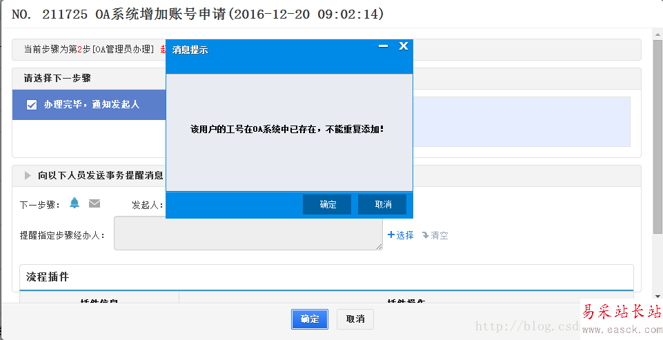 通過流程審批完畢后,流轉到OA管理員哪里,管理員在進行下一步轉交時即在后臺創建賬號,如果沒有錯誤則會提示創建成功,如果有錯誤也會進行提示。
