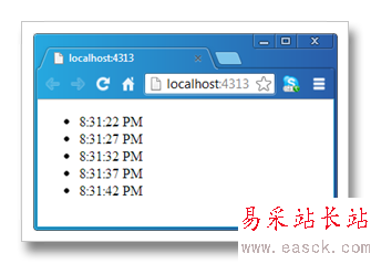 <!DOCTYPE html> <html> <head> <title>@ViewBag.Title</title> <script type="text/javascript" src="@Url.Coutent(“~/Scripts/jquery-...min.js”)"></script> <script type="text/javascript"> $(function () { window.setInterval(function () { $.ajax({ url'@Url.Action("GetCurrentTime")', success function (result) { $("ul").append("<li>" + result + "</li>"); } }); }, ); }); </script> </head> <body> <ul></ul> </body> </html>