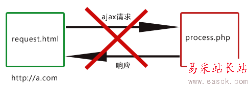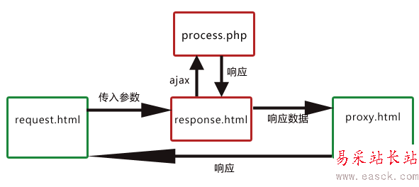 要實現域a.com的request.html請求域b.com的process.php,可以將請求的參數通過URL傳給response.html,由response.html向process.php發出真正的ajax請求(response.html與process.php都屬于域b.com),然后將返回的結果通過URL傳給proxy.html,最后由于proxy.html與request.html是在同一域下,所以可以在proxy.html利用window.top將結果返回給request.html完成跨域通信。
