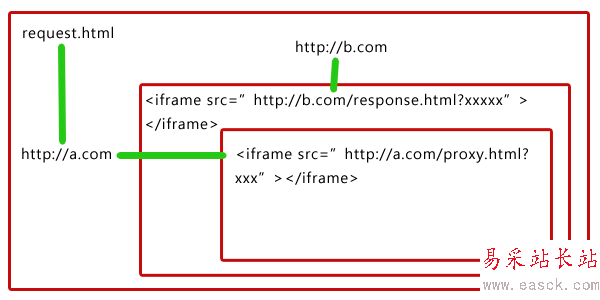 如下圖所示:域a.com的頁面request.html(即http://a.com/request.html)里面嵌套了一個iframe指向域b.com的response.html,而response.html里又嵌套了域a.com的proxy.html。