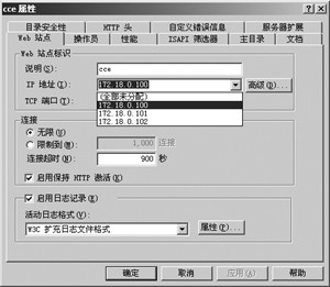 對于在“Internet信息服務”中為各站點設置不同的IP地址就非常簡單了,具體方法是:用鼠標右擊“Internet信息服務”管理工具窗口右邊的各站點名稱,選擇“屬性”,在出現的“屬性”設置窗口中選擇“Web站點”標簽頁面,更改各站點對應的IP地址即可,如圖4所示。