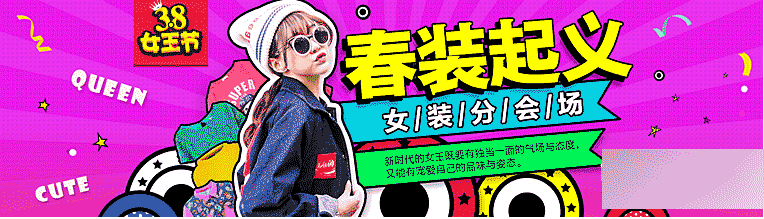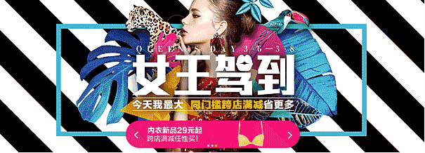 四、背景顏色大色塊 第四寶色塊大面積色塊的應用,在Banner設計中特別明顯。也是非常有效,天貓、淘寶、京東等這些國內電商平臺的活動經常是以色塊背景為主。色塊在很久之前就很流行,作為一種風格。在大色塊背景上面,白色的文案、圖案就成為了視覺焦點。在色塊背景上應用類似時尚的波普元素,畫面節奏感就出來了。