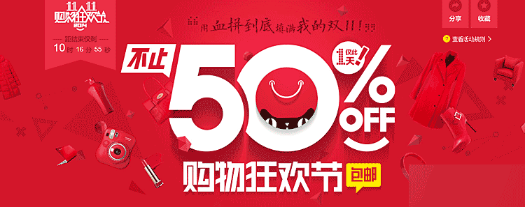 案例中背景顏色是整個藍色大色塊,在這樣的情況下。白色的文案就顯得非常突出了,成為了視覺的焦點。所以有時候我們會看到天貓、淘寶、京東的促銷活動中的會場Banner經常會這樣做,一是讓主題文案成為視覺的焦點,二是延展其它會場方便套用。沒有過多的特效處理,這樣大大的節約了時間成本。