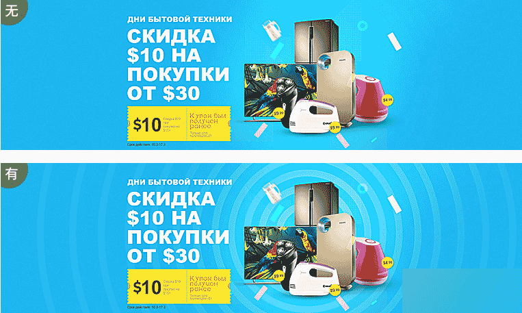 我就拿一個三角形圖案Banner對比添加和不添加圖案的感受,在沒有添加圖案的情況下雖然這個案例在其他方面我做了挺多視覺表現,但是沒有圖案還是會感覺少了一點節奏感和細節。當我們為背景層添加了圖案之后,畫面變得飽滿、同時也增加了促銷的感受。