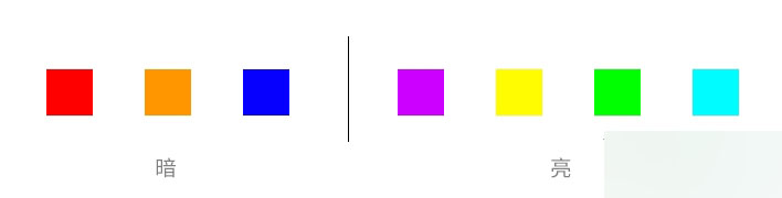 暗色和亮色沒有規定說哪一個顏色就是暗色或亮色,如果非要說那就是黑和白了。某一個顏色暗和亮是可以控制的,就像是顏色深淺。但是我們以飽和度最高的情況下,從最基本的紅橙黃綠青藍紫來說,如果它們對比起來就產生了暗和亮的。