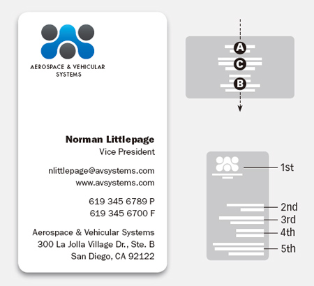 將相關的文字元素且合起來,立即就產生了一種清晰的閱讀效果,現在名片上的聯系信息能夠輕松地讓人從上到下觀看。上面豎版的排列中,標志形成了一個視覺焦點,所以我們的眼睛首先會移到上面觀看,然后很自然地由上到下地閱讀下面的聯系信息。