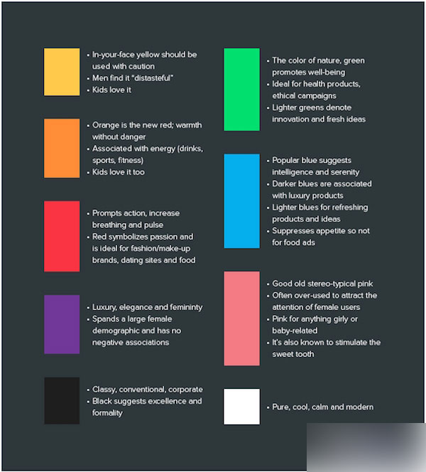 所以,當(dāng)你開始考慮色彩的心理學(xué)屬性的時(shí)候,盡量將整個(gè)配色方案作為整體來進(jìn)行衡量,而不是單獨(dú)為某個(gè)部分選取一個(gè)色彩,以期它能與其他部分協(xié)調(diào)工作。