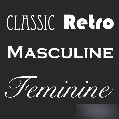 請注意前兩個字體強烈傳達了特定的過去時代。同樣,下面的兩個字體各自有著強烈的基于性別的特征聯系。有著堅硬邊緣的粗字體往往看起來更加陽剛和男子漢,同時,曲線玲瓏,纖細的字體顯示女性的和少女的特征。