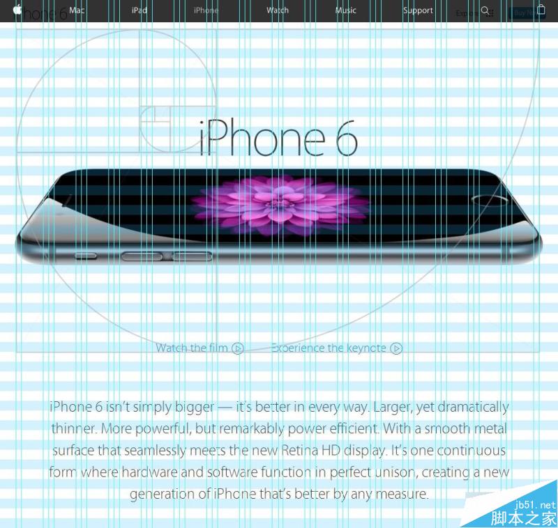 iPhone6官網不僅用到了網格系統,同時也應用黃金分割率確定文字、圖片與連接的間距,讓整個頁面看起來簡潔且合理。