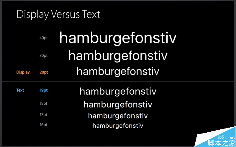 作為系統默認字體,San Francisco 字體是經過動態優化的,系統會隨著字體尺寸的變化而自動切換Display/Text兩個子字體族,通常 20pt 是一個切換的邊界尺寸。