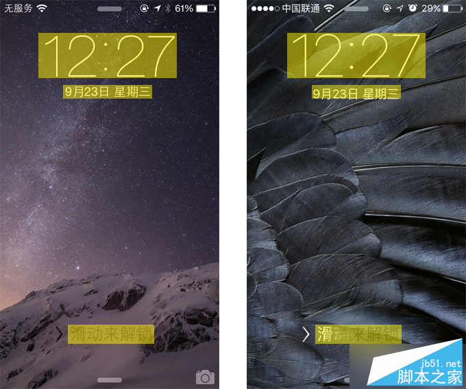 我們對比相同兩個界面可以發現,最直觀的感受是數字1、2和7由彎曲的筆畫變成直線筆畫。因為iOS 9中文面積稍大,所以日期星期與時間的行距增大了一些。
