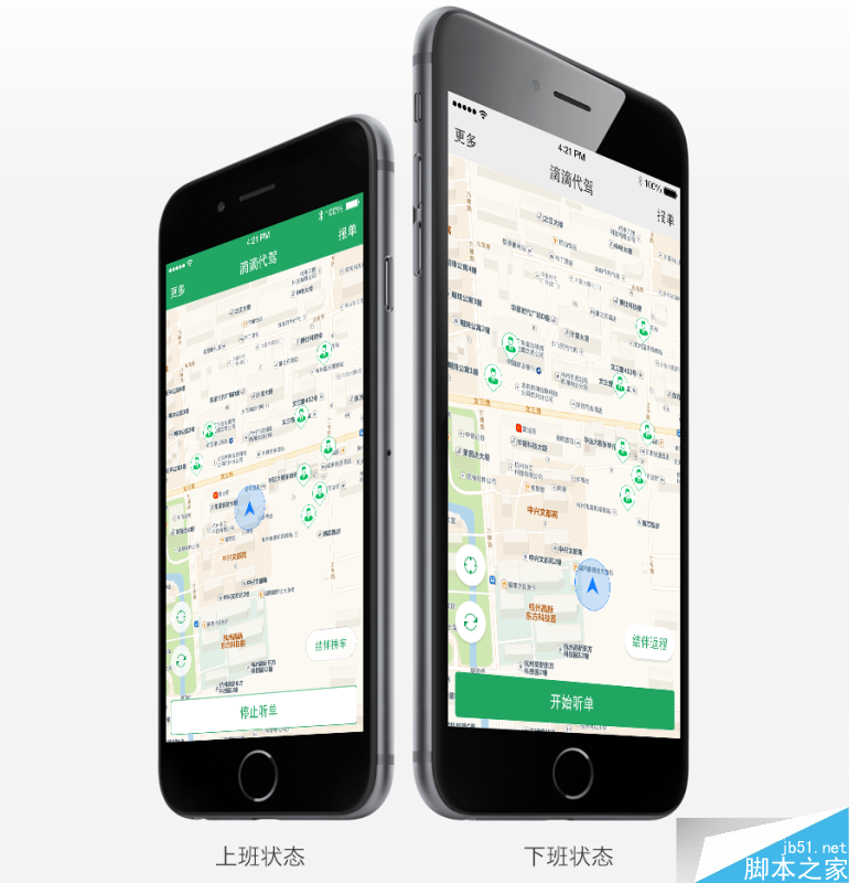 經(jīng)過(guò)討論,我們決定在工作狀態(tài)下,通過(guò)強(qiáng)化界面頂部導(dǎo)航欄的視覺(jué)比重去提示司機(jī)繼續(xù)完成工作(左);而在非工作狀態(tài)下,則通過(guò)將視覺(jué)焦點(diǎn)放在底部按鈕,去觸發(fā)用戶點(diǎn)擊(右)。