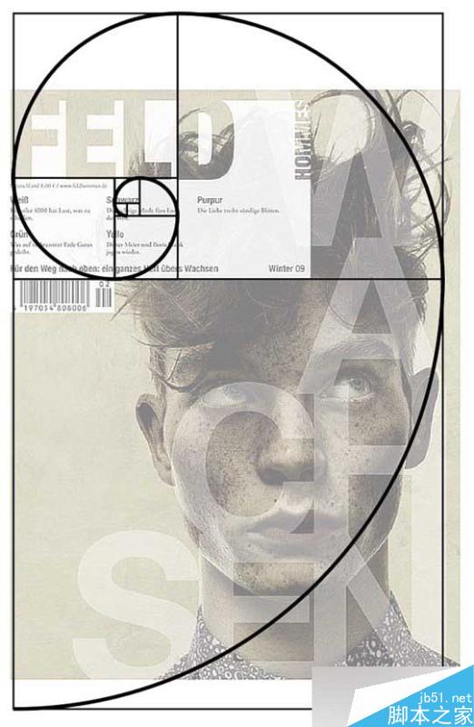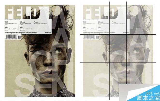 Feld雜志的設計,也參考了黃金比例三分法,左上方的標題和內(nèi)容區(qū)塊明顯是參考分割線來設計的,而右下方的背景中的人物的鼻子——也就是人物的中心點正好壓在右下方的交點上。
