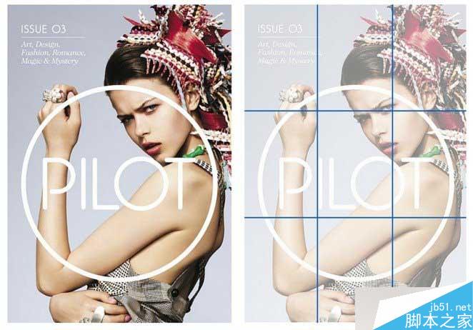 Jason Mildren 為Pilot 雜志設計封面,其中的布局采用的是均勻三分法來構(gòu)建視覺重心,圖中模特的眼、拇指和手臂軸心都處在視覺重心上,人物位置靠右下,留白靠左上,又是一個平衡的布局。